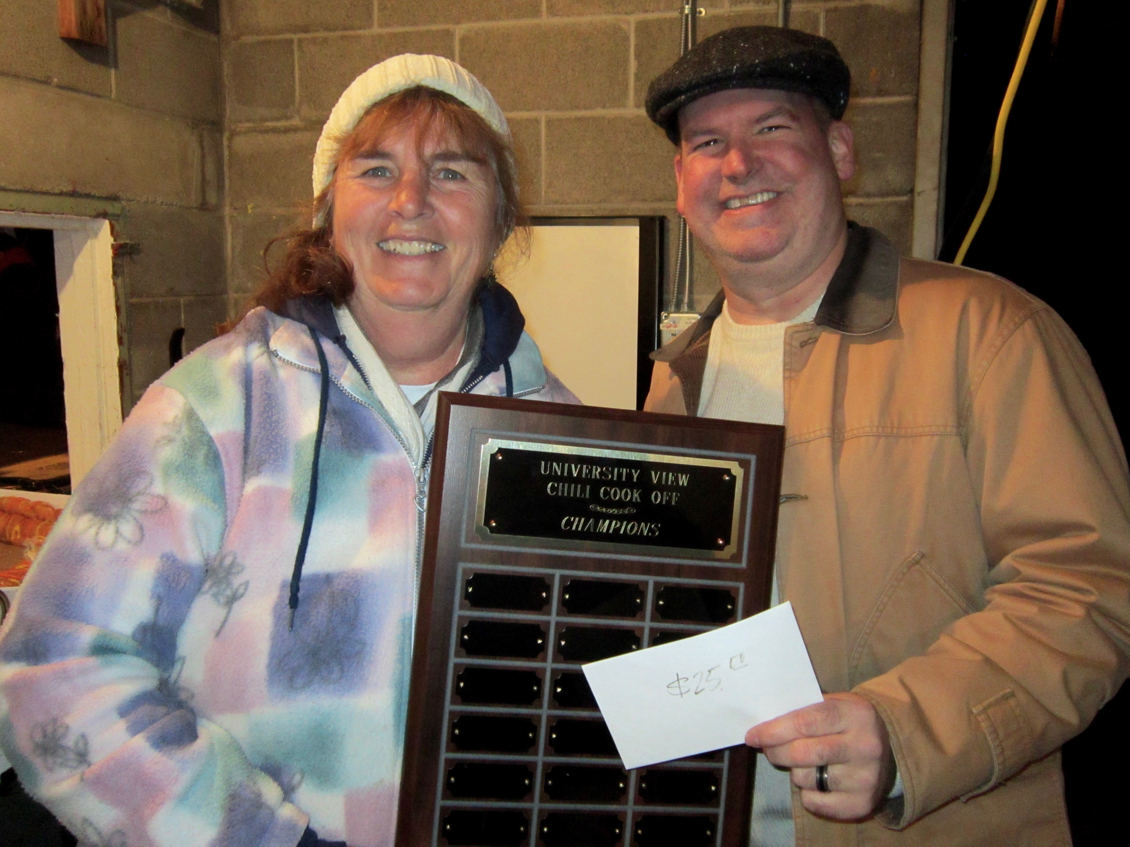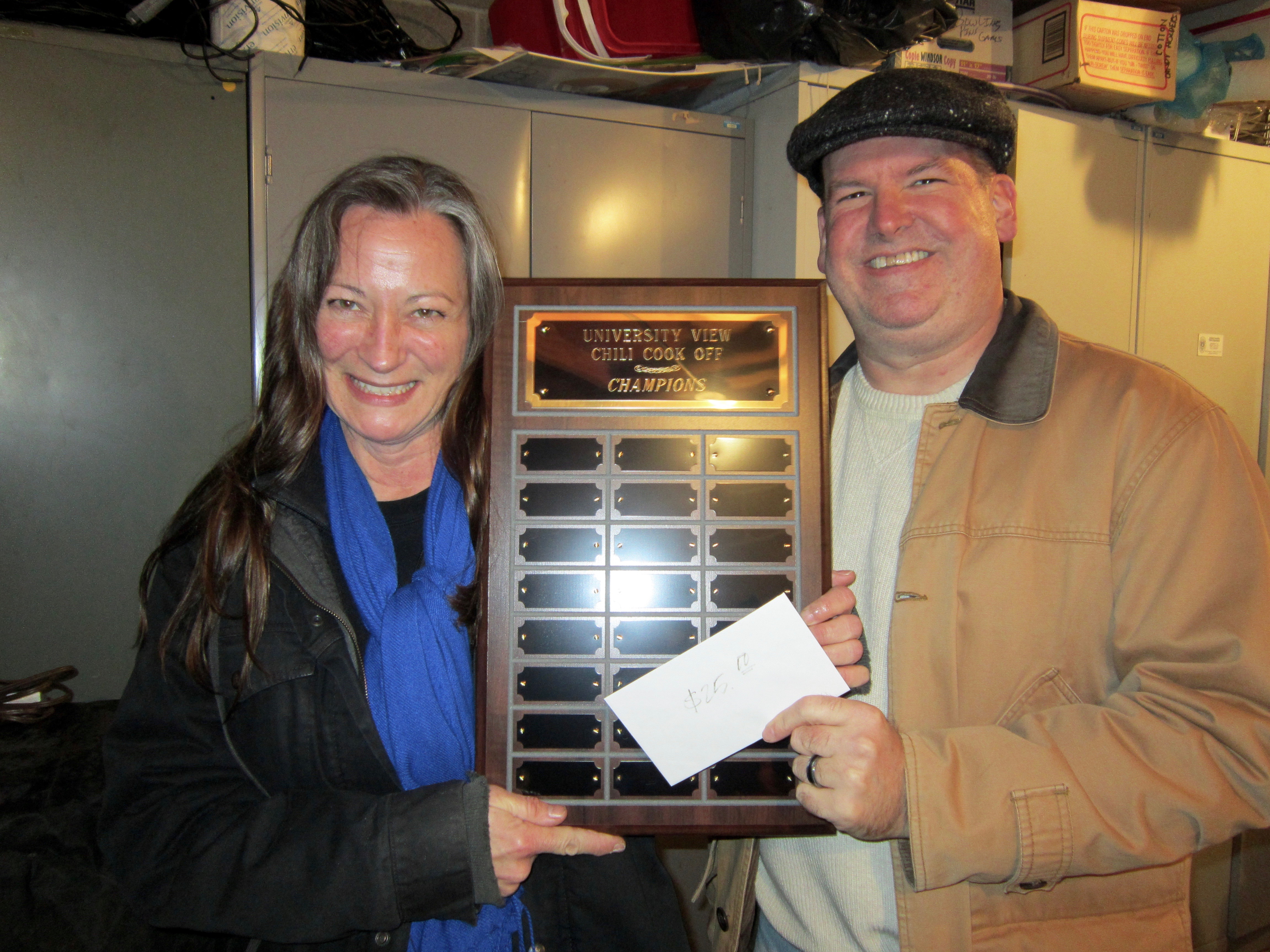 Congratulations to our Chili Champions for 2015. Debbie Sweeney won the Traditional Chili category for the first time EVER, and Pat Deacon won the Non-Traditional Chili category with Mexican Chili. Both neighbors won $25 and will be added to the new UVCA Chili Cookoff Contest Plaque! Congrats! (Pictured with UVCA Treasurer, Wayne Newman)