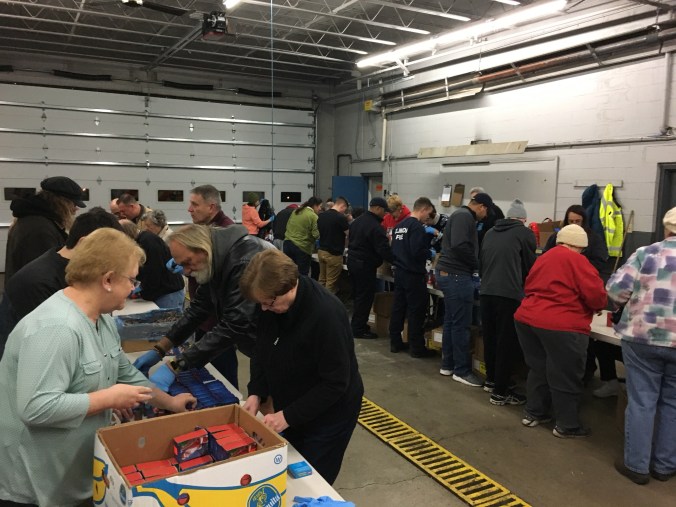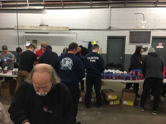 Wow! Thanks to our over 35 volunteers who came out to help pack candy for the annual Clinton Township Christmas Parade. According to Chief Fraley we set a NEW RECORD! 75 minutes and 3,250 boxes packed! Thanks everyone! Santa will be delivering all the goodies this Saturday from 9:00 AM on the west side then to the east side around 11:00 AM!
