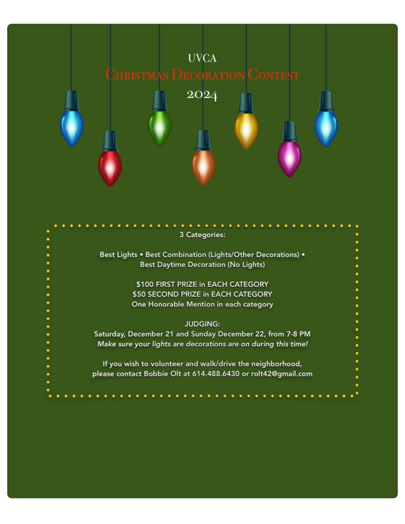 2024 UVCA Christmas Decoration Contest! December 9, 2024 / admin Share this: Click to share on X (Opens in new window) X Click to share on Facebook (Opens in new window) Facebook Like Loading... Related